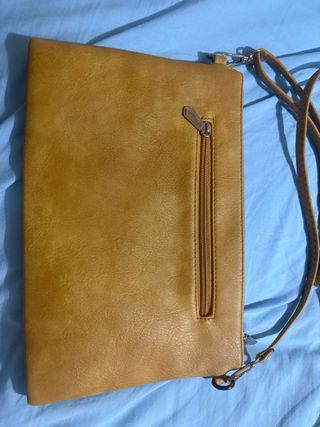 Bolso bandolera de la marca Stradivarius en un llamativo color mostaza. Su diseño es moderno y versátil. - Cierre de solapa con broche metálico. - Correa ajustable combinada en piel y cadena. - Textura granulada en el material.