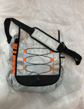 Práctica mochila o bandolera con un diseño llamativo. - Cierre de solapa. - Tira ajustable para llevar al hombro o cruzada. - Detalles de rayas rojas sobre fondo blanco.