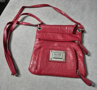 Bolso bandolera de la marca Nicole Miller en color burdeos. Tiene un diseño texturizado y varios compartimentos. - Cierre principal con cremallera. - Bolsillo frontal con cremallera. - Compartimento adicional en la parte delantera.