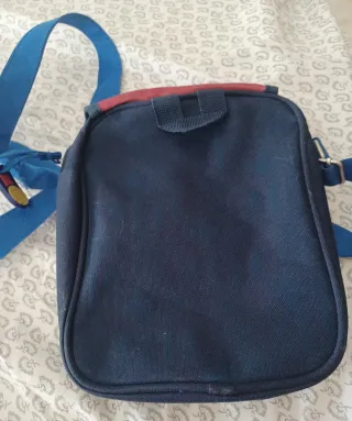 Práctica mochila bandolera de la marca Trident, perfecta para llevar tus pertenencias de forma cómoda y segura. Diseño en color azul y negro. Correa ajustable para mayor versatilidad. Tiene tres bolsillos espaciosos. Tiene algunos desgastes apreciables en las fotos y uno de los tiradores de las cremalleras está roto, aunque la cremallera funciona bien.
