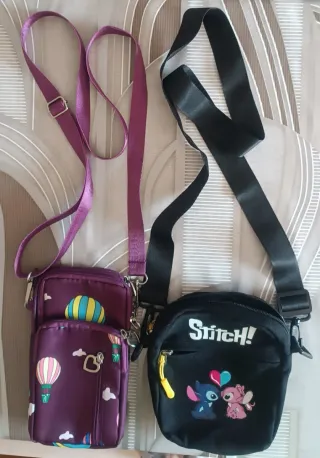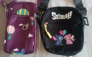 Lote de dos bolsos bandolera de tamaño pequeño, perfectos para llevar lo esencial. - Un bolso es de color morado con un diseño de globos aerostáticos. Medidas: 20 cm de alto y 11 cm de ancho. - El otro bolso es negro con un estampado de Stitch y un corazón. Medidas: 17 cm de alto y 15 cm de ancho.