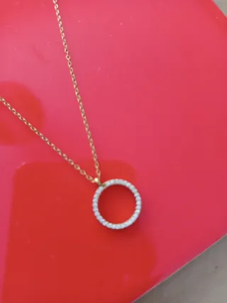Elegante collar dorado con un diseño circular adornado con pequeñas incrustaciones brillantes. Puesta una vez en Navidad. Corta por debajo del cuello - Cadena fina y delicada. - Colgante en forma de círculo.