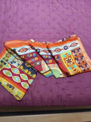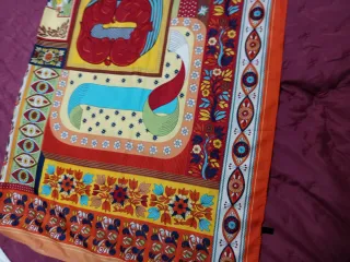 Elegante pañuelo de seda con un diseño vibrante y llamativo. Su tamaño grande lo hace muy versátil para diferentes usos. Foulard, pareo, e incluso toalla fina para la playa - Estampado intrincado con motivos florales y geométricos. - Tacto suave y sedoso. - Ideal como accesorio de moda. Nunca se ha usado.
