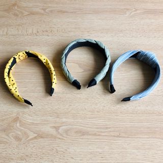 Conjunto de tres diademas con diferentes diseños. - Una diadema amarilla con lunares negros. - Una diadema verde trenzada. - Una diadema azul con rayas blancas.