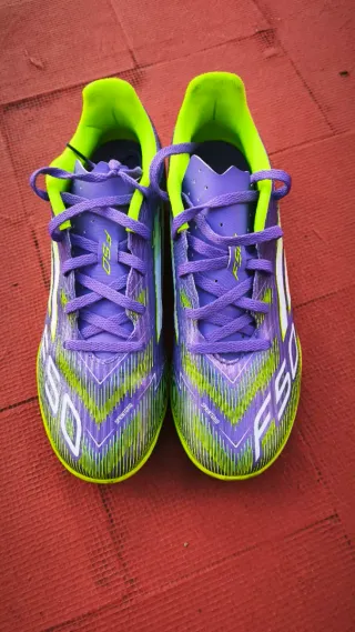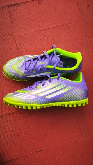 Usadas solo en dos entrenos. - Diseño en tonos morados y verdes. - Cierre con cordones. - Suela TF (Turf).