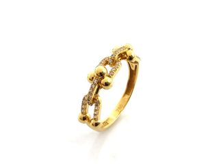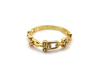 Elegante anillo con un diseño moderno y ajustable Alta Calida. - Fabricado en acero inoxidable con baño de oro de 18 quilates. - Detalles en blanco que aportan un toque de luz.