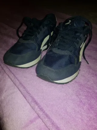 Zapatillas deportivas Adidas en talla 42. - Diseño clásico con las tres rayas. - Combinación de blanco y azul.