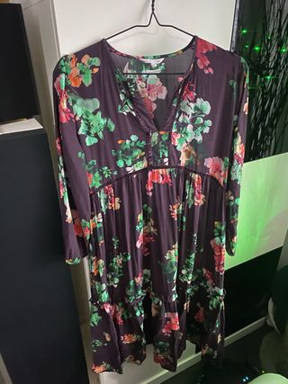 Elegante traje de chaqueta prácticamente nuevo. - Diseño con estampado floral en tonos azules y plateados. - Solapa ancha y cinturón con hebilla. - Mangas largas con puños vueltos.