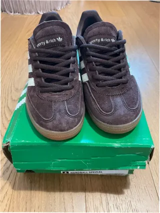 Zapatillas Adidas Handball Spezial en colaboración con Sporty & Rich. - Diseño en ante marrón. - Detalles de las tres rayas en blanco. - Logo de Sporty & Rich en la lengüeta.