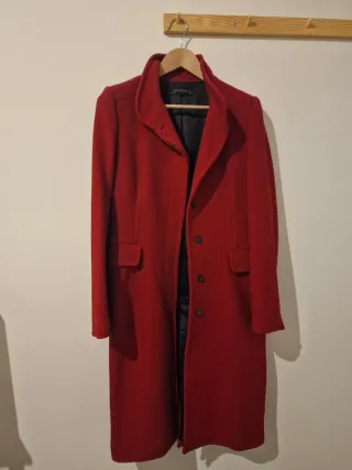 Elegante abrigo de Zara con cuello alto. - Color rojo discreto - Diseño clásico y atemporal. - Cierre de botones.