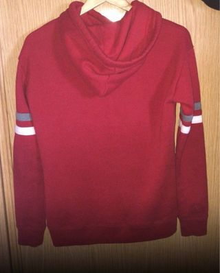 Sudadera con capucha de la marca Hollister. - Color rojo vibrante. - Diseño con logo circular en el pecho. - Mangas con detalles de rayas. - Bolsillo frontal tipo canguro.
