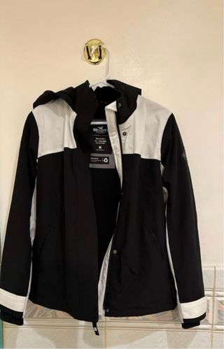 Abrigo de la marca Hollister con un diseño moderno en color negro y blanco. Perfecto para mantenerte abrigado. - Cierre de cremallera y botones a presión. - Capucha ajustable. - Bolsillos laterales con cierre. - Puños y bajo con detalle blanco.