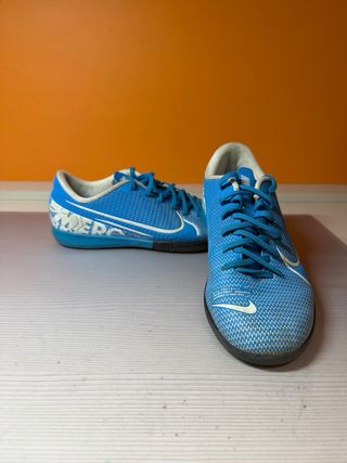 Zapatillas de fútbol sala Nike Mercurial. Diseño en color azul con detalles en blanco. Ideales para jugar en pistas interiores.