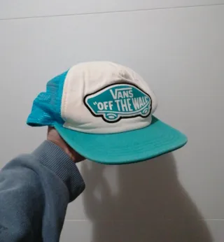Gorra estilo trucker de Vans con paneles de malla. - Parte frontal blanca con logo. - Paneles laterales y traseros en malla celeste. - Visera curva en color turquesa.
