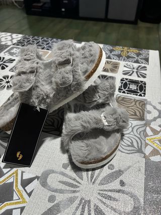 Zapatillas de estar por casa con un diseño muy suave y acogedor. - Material exterior de pelo sintético. - Dos tiras ajustables con hebilla. - Suela de corcho y goma. Dos disponibles si te llevas los dos a 8€