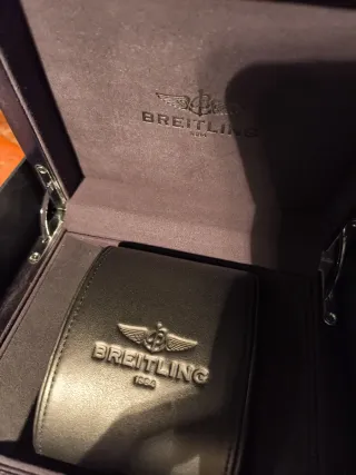 Elegante estuche original de Breitling - Fabricado en madera con detalles en negro. - Interior forrado en terciopelo gris. - Incluye estuche de viaje de cuero negro con el logo de Breitling.