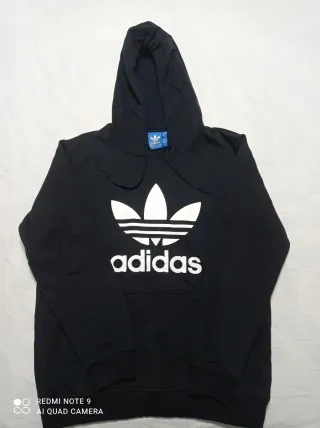 Sudadera con capucha de Adidas en color negro. (55-75) (16-35) En perfecto estado,sin apenas uso!!! Talla L. Medidas: Ancho Axila-Axila: 64 cm. Largo: 72 cm. - Logo de Adidas en blanco. - Bolsillo frontal. - Puños y cintura elásticos.