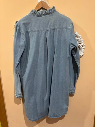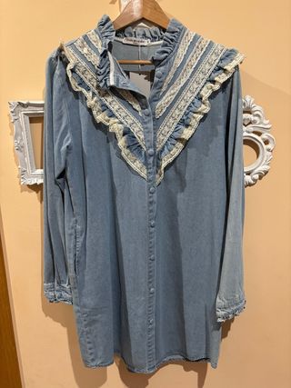 Vestido vaquero con detalles de encaje en el cuello y puños. Un diseño único y femenino. - Cuello alto con volantes y encaje. - Mangas largas con puños de encaje. - Cierre de botones en la parte delantera. - Largo hasta medio muslo.