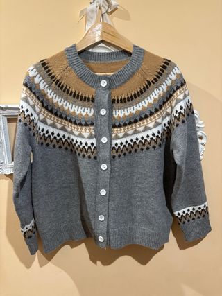 Chaqueta de punto con un diseño de grecas en la parte superior y en los puños. - Cuello redondo. - Cierre de botones. - Manga larga.