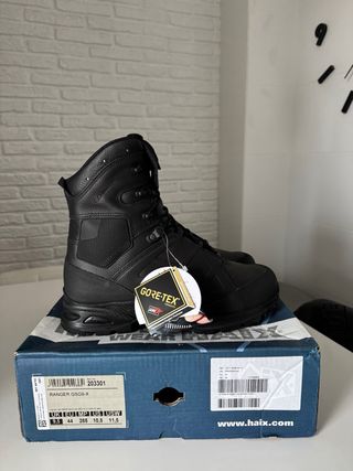 Botas de alta calidad Haix Ranger GSG9-X con tecnología Gore-Tex. - Modelo: Ranger GSG9-X - Talla: 44 EU / 10.5 US - Color: Negro - Membrana impermeable y transpirable Gore-Tex - Suela antideslizante