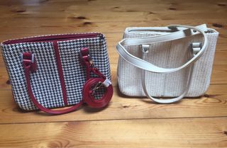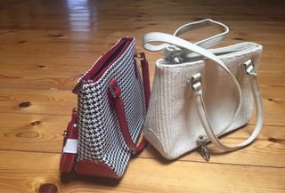 Dos bolsos con un diseño clásico y elegante. - Un bolso con estampado de pata de gallo en blanco y negro con detalles en rojo. - Un bolso de tejido en color crema con asas de piel.