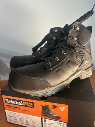 Botas de seguridad Timberland Pro Hypercharge en color negro con detalles azules. Diseñadas para ofrecer protección y comodidad. - Parte superior de cuero. - Suela de goma duradera. - Cierre de cordones. - Waterproof - punta de composite