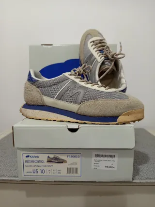 -PRECIO CERRADO -Zapatillas deportivas Karhu Mestari Control en talla 44. Combinan diseño retro con materiales modernos y detalles reflectantes. - Modelo: F840010 - Color: Silver Lining/True Navy - Talla: US 10 / UK 9 / EU 44 / MM 280 - Precio original: 119,95 Eur