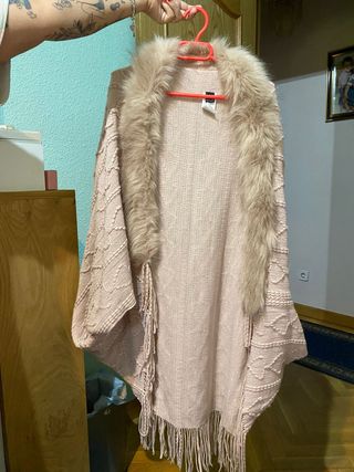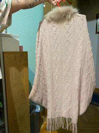 Elegante poncho de punto en tono beige, con un suave detalle de pelo en el cuello y los bordes. Su diseño abierto y las aplicaciones de flecos le dan un toque bohemio y chic. - Tejido de punto con textura. - Adorno de pelo sintético. - Flecos decorativos en los bajos.