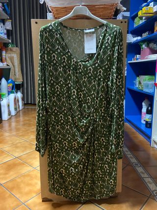 Vestido con un bonito estampado geométrico en tonos verdes y beige. Tiene un diseño drapeado en la parte delantera que le da un toque elegante. Cada uno a tres euros - Manga larga. - Cuello en V.