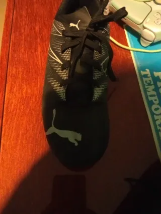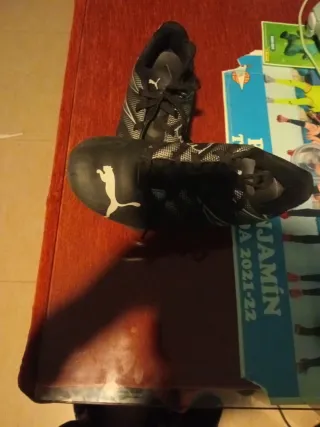 Botas de fútbol para niño de la marca Puma. - Diseño en color negro con detalles blancos. - Logo de Puma en blanco en la parte delantera y lateral.