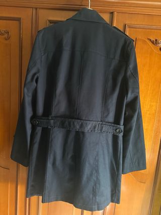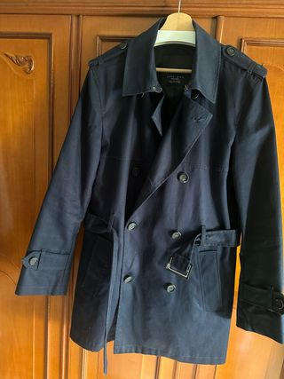 Gabardina clásica de Zara en color azul marino. - Diseño de doble botonadura. - Cinturón ajustable a la cintura. - Hombreras decorativas. - Puños con trabillas y botón.