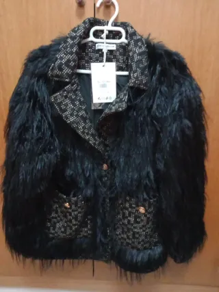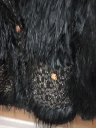 Elegante chaqueta de pelo para mujer, con detalles en dorado. - Diseño de pelo largo y suave. - Solapas y bolsillos con tejido tweed y lurex. - Cierre de botones dorados.