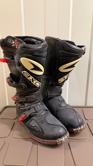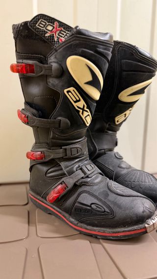 Botas de moto marca Boxer en color negro con detalles rojos. - Cierre con hebillas ajustables. - Protecciones en la zona delantera y tobillo. - Suela reforzada. - Tienen Polo pero estan muy bien - Bastante pesadas