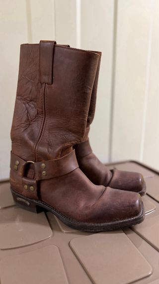 Botas Sendra de cuero marrón, estilo motero. - Diseño clásico con correa y hebilla. - Caña alta. - Suela resistente.