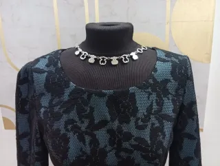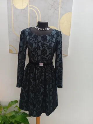 Elegante vestido de cóctel con un diseño sofisticado. - Manga larga. - Tejido con textura. - Cinturón con detalle de pedrería con etiqueta .y precio real 125€