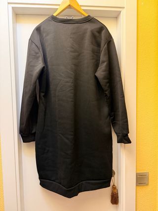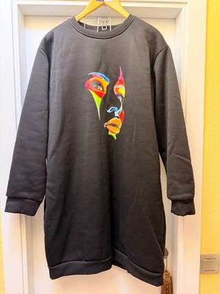Vestido sudadera con un llamativo estampado de rostro. - Diseño de cara con colores vibrantes. - Manga larga. - Corte de sudadera. - Largo hasta la rodilla. Talla XL holgado, sirve para 42-44 también. Envíos rápidos
