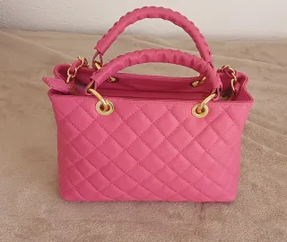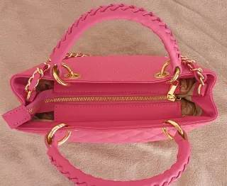 Bolso original BULAGI, fabricado en piel auténtica (vera pelle) y hecho en Italia. Color rosa con elegante diseño acolchado en rombos y herrajes dorados. Se puede llevar de mano gracias a sus asas superiores o al hombro/bandolera con su cadena. Interior amplio y práctico.