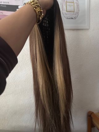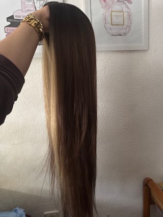 Peluca hermosa , abundante, larga, puedes rizar, lacear, lavar, marron con mechas rubias delantera, frontal natural