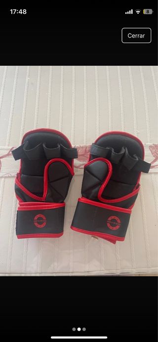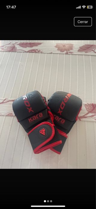 Guantes de MMA de la marca RDX, modelo Kara. - Diseño en color negro con detalles en rojo. - Cierre de velcro ajustable.