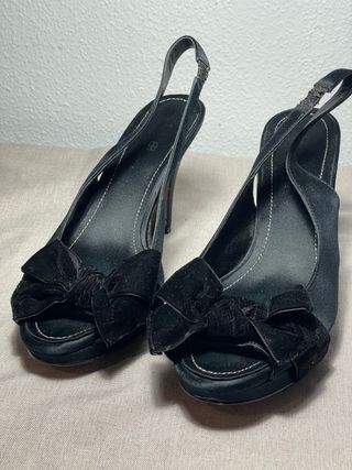 Elegantes zapatos de tacón negros con un detalle de lazo. - Diseño peep-toe. - Correa trasera tipo slingback. Con signos de desgaste - Tacón de aguja. Usados pero bien conservados