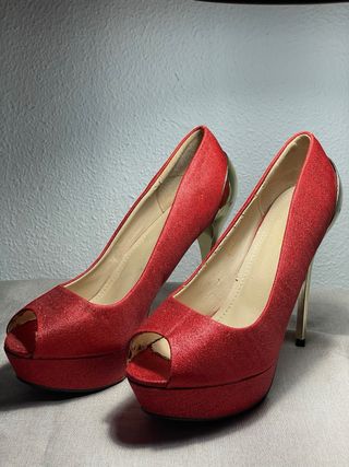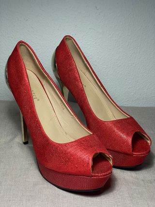 Elegantes zapatos de tacón con un diseño llamativo. - Acabado brillante en color rojo. - Detalle metálico en el talón y tacón. Se puede ver en las fotos los signos evidente de uso y desgaste de ahi su precio super accesible