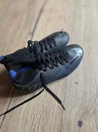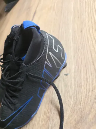 Botas de fútbol Nike con un diseño moderno y llamativo. - Combinación de colores negro y azul. - Cierre con cordones para un ajuste seguro. - Detalle del logo de Nike.