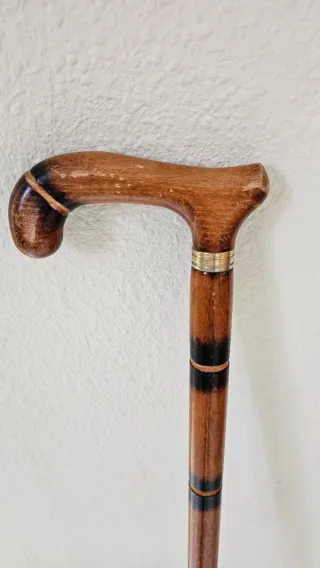 Un bastón de madera con un diseño clásico y refinado. - Mango curvo de madera. - Detalles metálicos dorados en el cuello y en la caña. - Caña de madera con bandas oscuras.