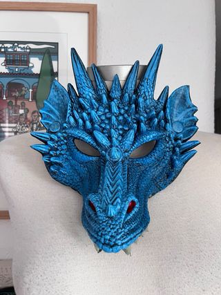 Máscara de dragón con un diseño detallado y llamativo, perfecta para disfraces. - Colores vibrantes azul y rojo. - Talla única. - Para adultos o niños .