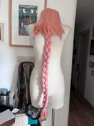 Peluca larga de color rosa con una longitud de 95 cm. Incluye tres lazos negros decorativos. - Trenza larga y voluminosa. - Dos lazos en la parte superior y uno en la punta de la trenza. - Diseño inspirado en personajes de anime.