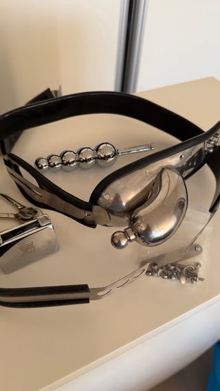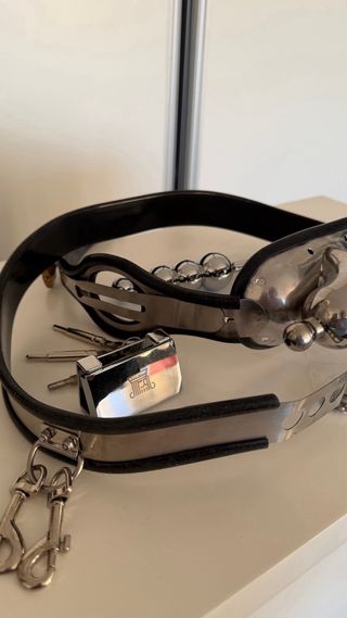 Cinturón de castidad metálico con accesorios. - Fabricado en metal. - Incluye cadena y candado. - Cintura al maximo 85 cm