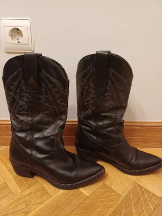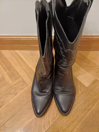 Botas negras de estilo campero, elaboradas en piel. - Diseño clásico. - Costuras decorativas. - Tacón bajo.
