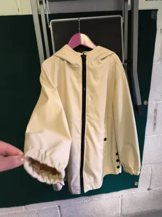 Chubasquero de color beige con capucha. - Cierre de cremallera. - Dos bolsillos frontales con botón. - Puños elásticos negros. -talla 10 años