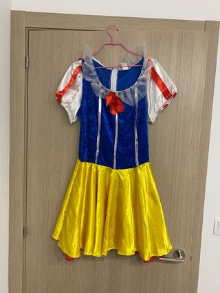Disfraz inspirado en Blancanieves, ideal para fiestas o eventos. - Cuerpo superior azul con detalles plateados. - Mangas abullonadas blancas con ribete rojo. - Cuello con volantes blancos. - Lazo rojo en el pecho. - Falda amarilla brillante. - Estado magnifico