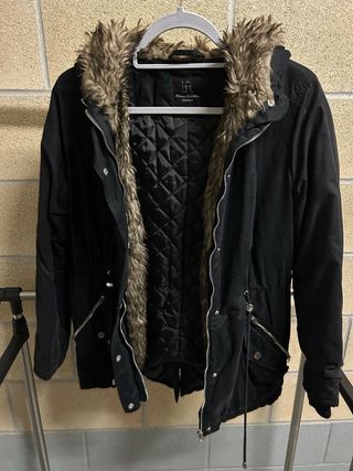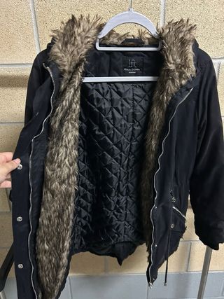 Parka acolchada con capucha de pelo sintético. - Cierre de cremallera. - Bolsillos laterales con cremallera. - Puños elásticos. Prenda en muy buenas condiciones. Precio algo negociable.Da algo más que talla S. 130 de circunferencia de pecho y 44 de hombro.